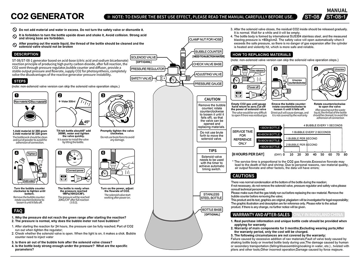 เครื่องกำเนิด CO2 สำหรับตู้ปลา ST-08-1 ใช้หลักการของปฏิกิริยากรด-เบส โดยทำปฏิกิริยากรดซิตริกกับโซเดียมไบคาร์บอเนตเพื่อผลิต CO2 ที่มีความบริสุทธิ์สูง ด้วยสูตรสูตรทางวิทยาศาสตร์และกระบวนการทำปฏิกิริยาที่มีประสิทธิภาพ อุปกรณ์จะปล่อยก๊าซคาร์บอนไดออกไซด์อย่างต่อเนื่อง เพื่อจ่ายก๊าซให้กับพืชในตู้ปลาอย่างต่อเนื่อง ตอบสนองความต้องการในการสังเคราะห์ด้วยแสงและส่งเสริมการเจริญเติบโตที่ดี เมื่อเปรียบเทียบกับเครื่องกำเนิดปฏิกิริยาแบบเดิม ST-08-1 มีการควบคุมแรงดันที่ได้รับการปรับปรุง มาพร้อมกับตัวควบคุมแรงดัน ตัวนับฟอง และเครื่องกระจายแรงดันโดยเฉพาะ ทำให้แรงดันเอาต์พุตมีความเสถียรและการกระจายฟองสม่ำเสมอ ขจัดความไม่สะดวกที่เกิดจากความผันผวนของแรงดัน